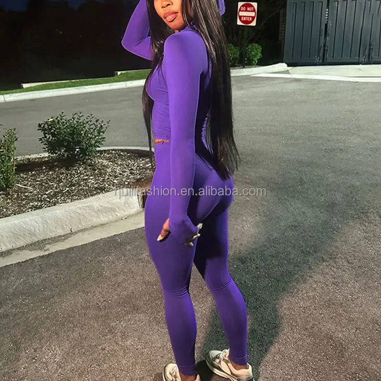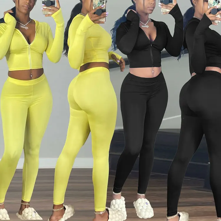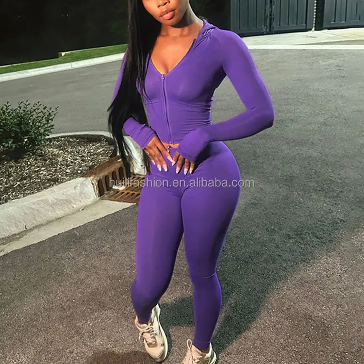 Huili Custom Logo High Stretch Tight Zipper Long Sleeve Hooded Crop Top and Pants Gmy Yoga Wear Two Piece Legging Sets for Women